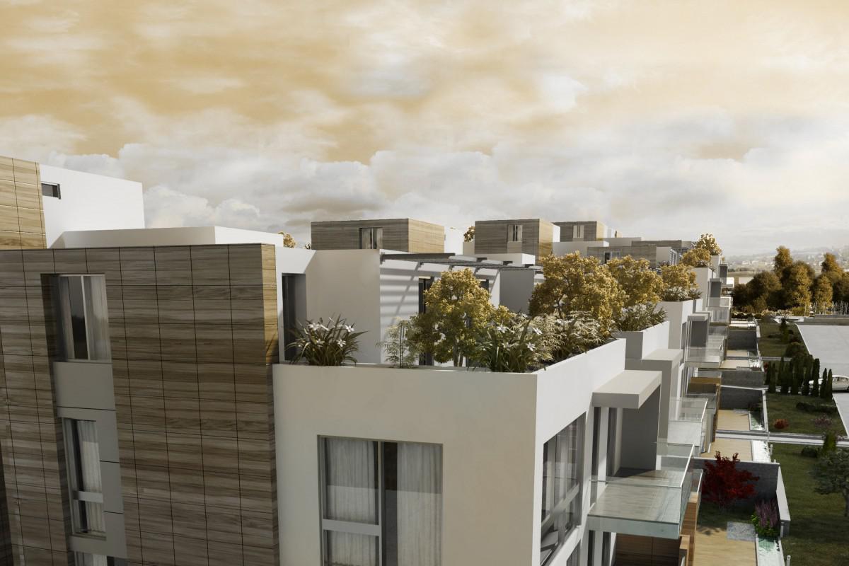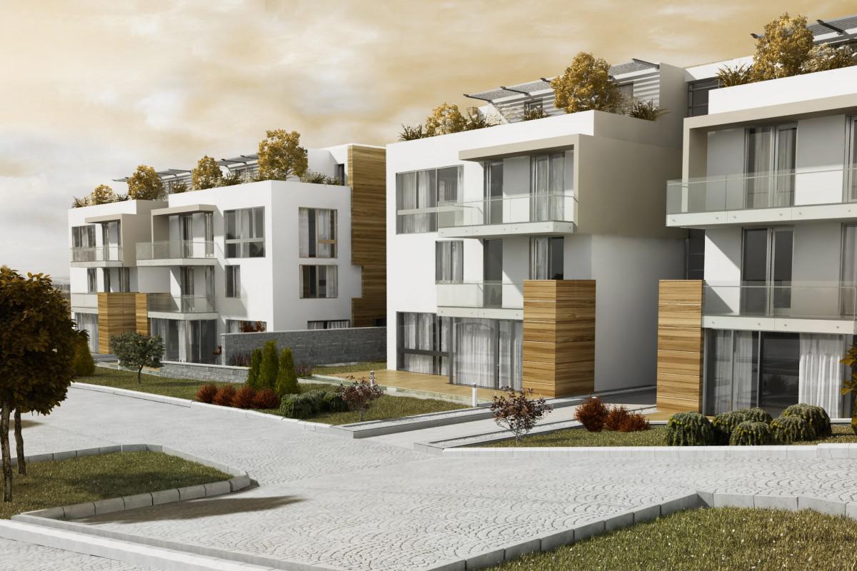 The project consists of 4 blocks including 26 houses of 3 different types. Buildings, located on a line, are connected to each other with the car parking on the basement. Architectural and landscape solutions are generated by minimizing the inclination of the land. Landscape plan of the site has simple and natural design. All the units are either garden duplex or attic duplex. None of the house is wall to wall neighbor to another. Each unit provides as much privacy as a detached house.
