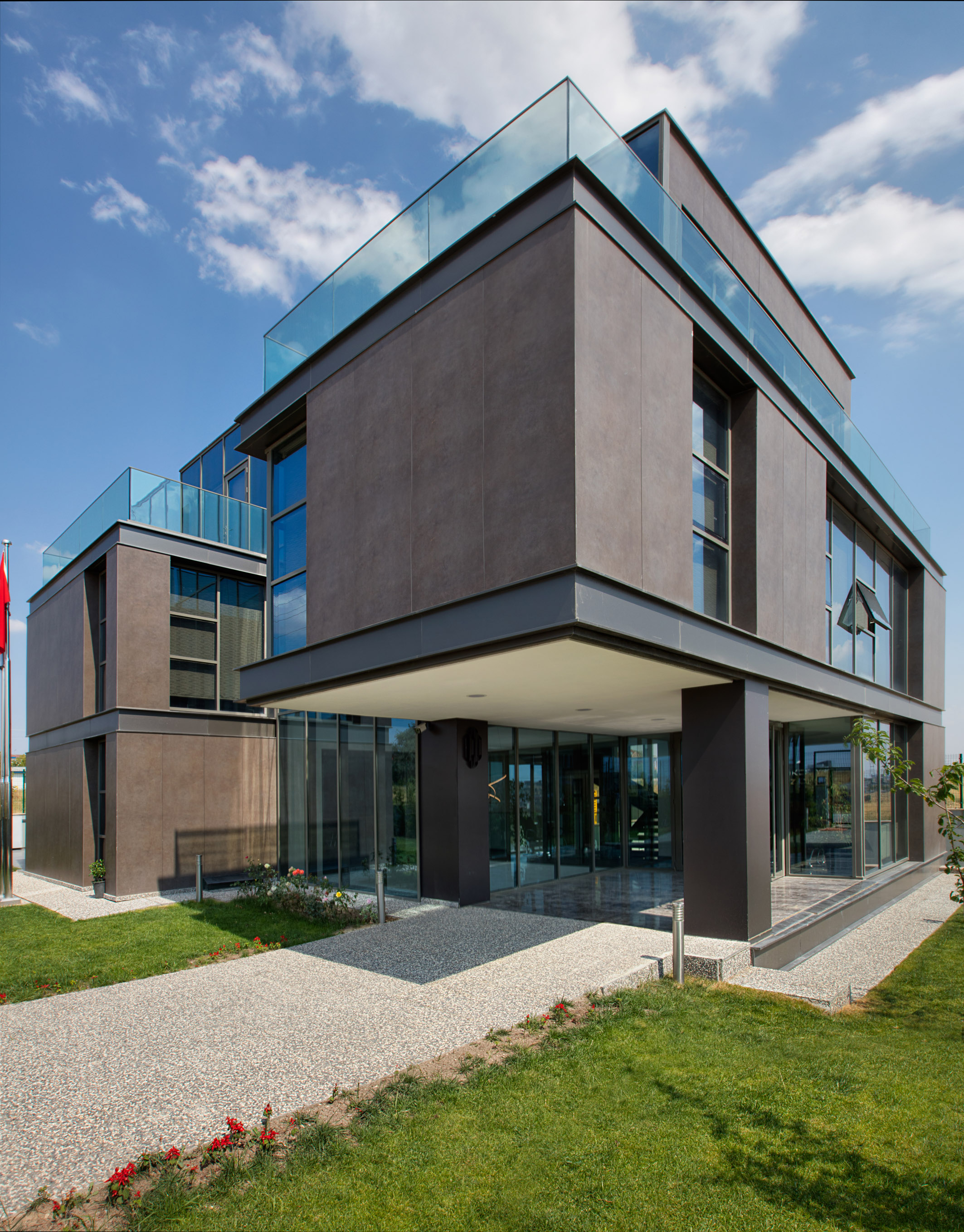 It is designed for a specific financial consulting firm. The building locates at the center of the plot revolves around with a gallery located in the middle interiors. At the plan fiction, full and hollow prisms are met to each other.
