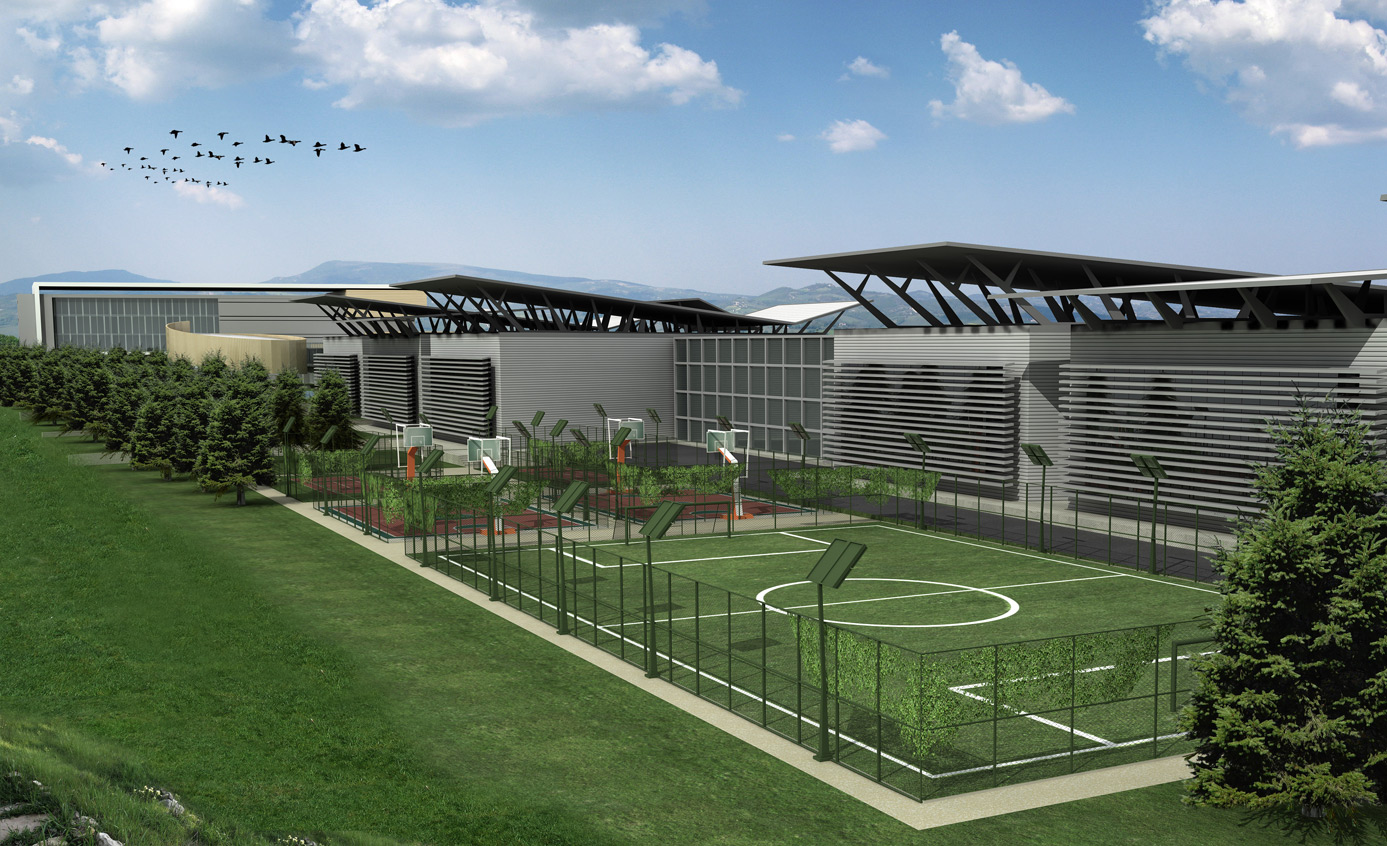 - Maximizing the size of the open (green) area that serves to social field. The green valley arranged in the eastern axis of buildings serve to both sporting activities and other social open area uses. Fields are located behind the fair building. Thus, the visual heights created by the protective nets they are surrounded with are hidden from the view angles of the structures.
